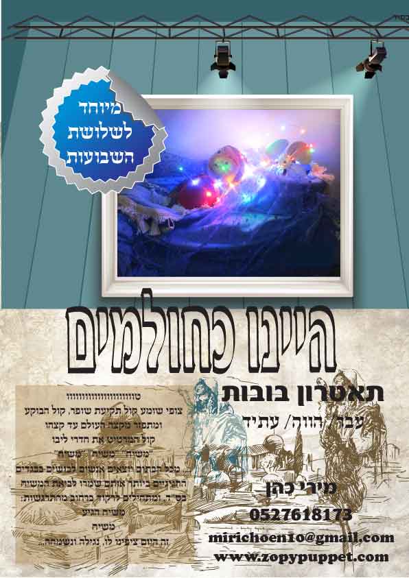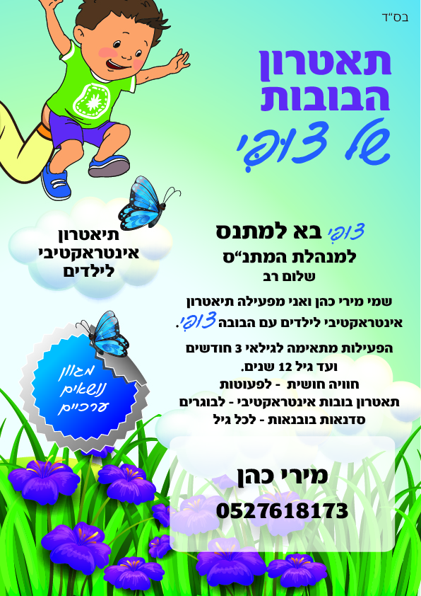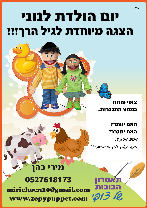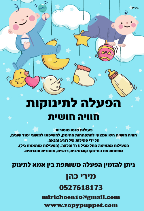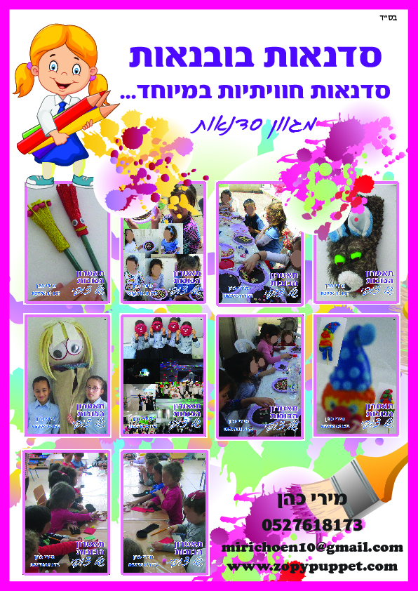 תאטרון הבובות של צופי הכי מתוק! הכי אומנותי!Tabs פרטי העסק תאטרון בובות אינטראקטיבי וסדנאות בובנאותשמי מירי כהן ואני מפעילה תיאטרון אינטראקטיבי לילדים עם הבובה צופי. הפעילות מתאימה לגיל הרך ולגיל ביה"ס היסודי חוויה חושית - לפעוטות תאטרון בובות אינטראקטיבי - לבוגרים היינו כחולמים:לגילאי 6-12 תאטרון בובות מפעים ומרתק על ילד שטס בחללית זמן לתקופות שונות בתולדות עם ישראל עד בניין ביהמ"ק במהרה בימינו. אמן. תאטרון בובות יום הולדת לנוני:לגילאי 2-7 צופי מתקשה לוותר לאחותו על בית שבנה. אמא מספרת לצופי סיפור מתוך ספר פופ אפ ענק ומרתק על נוני ברווזוני שמתקשה לוותר על הכדור שלו, כולל הפעלה של הילדים. סדנאות בובנאותבניית בובות במגוון טכניקות וחומרים, למגוון גילאים חוויתי! אומנותי! מקנה טכניקות מדהימות! לצפיה בקליפ תוכנית לקטנטנים לחצו כאן קהל יעד: ילדות יסודיילדיםלכל המשפחהנערותנשיםנשים ונערותפעוטות- גיל הגן לחצו כאן להורדת הפרוספקט.pdf לחצו כאן להורדת הפרוספקט.pdf לתשומת לבכם: מופיעים בכל חלקי הארץמגיעים עם כל הציוד הנדרשאזור פעילות: מופיעים בכל הארץתאטרון הבובותתאטרון בובותסדנאותמירישתף זאת: